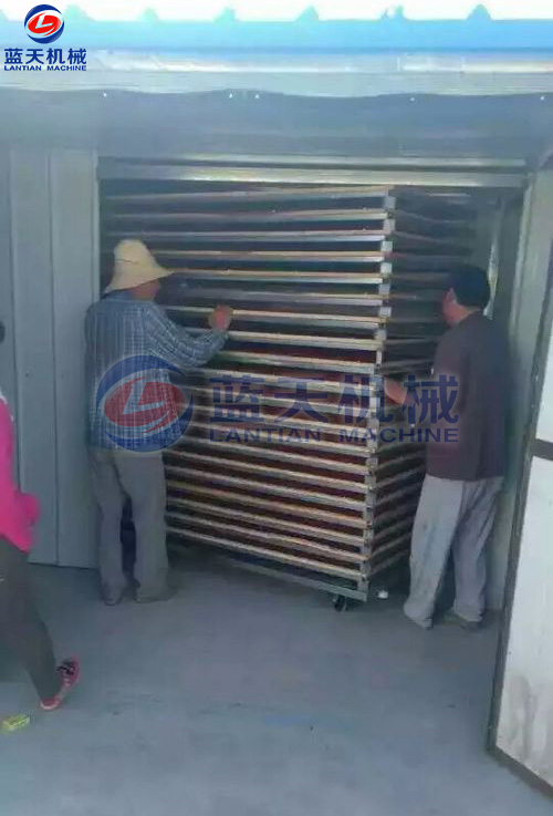 鮮果由于果內(nèi)的水分外滲,皮層聚集充分的非結(jié)合水分,這是因?yàn)楸砻娴乃魵鈮号c溫度氣壓基本相同,壓迫果實(shí)內(nèi)部水分很快移向表面以滿足表皮水分汽化的需要。果實(shí)內(nèi)失水率達(dá)到近50%時(shí),室內(nèi)溫度自然上升到50℃-55℃,循環(huán)風(fēng)速可有所下調(diào),果內(nèi)含水越少,脫水時(shí)間越短。此期歷時(shí)12小時(shí)左右。大量地脫水使果實(shí)體形縮小,即平常說(shuō)的呈半干狀態(tài),此期稱重測(cè)水,果實(shí)內(nèi)含水30%左右。